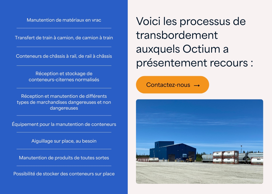 Le transbordement est une étape cruciale pour la marchandise en transit du port à sa destination. Confiez le transfert de vos cargaisons à des professionnels. Octium a tout l’équipement nécessaire pour protéger vos précieux produits de base. Nous accommodons toutes les exigences spéciales de transbordement, même les tâches difficiles et les demandes uniques.